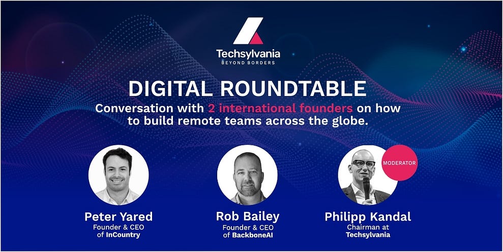 Wishful to learn more about how successful teams are built across the globe, the Techsylvania team organized Digital Roundtable #2 last month, where renowned professionals joined this mission of shaping the future with their insights on remote teams. Peter Yared, Founder & CEO of InCountry and Rob Bailey, Founder & CEO of BackboneAI, moderated by our Techsylvania representative — Philipp Kandal, discussed the in-depths of building such teams, going through the unique challenges, as well as the understanding the company culture.