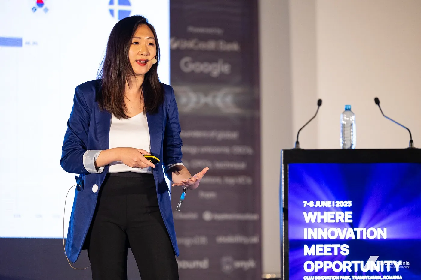 Andrei Stamatian, the UniCredit Bank representative & expert in the banking industry, provided insights into digital transformation and its impact on the banking sector. He discussed the key drivers of digital transformation in a regulated industry and highlighted conversational AI with natural language as a transformative technology. Stamatian showcased UniCredit Bank’s use of conversational AI and introduced Ioana, their AI service consultant, stating the enhancement of customer experiences.